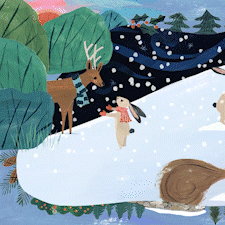 This is such a sweet story ending in a joyous celebration of community, friendship, and collaboration, with a small hint of environmentalism. The illustrations beautifully reflect the colors and symbols of the season with evergreens, holly, snowberries, red rosehips, and scarf bedecked animals framed by a gentle snow storm. It is a wonderful addition to any Christmas collection.